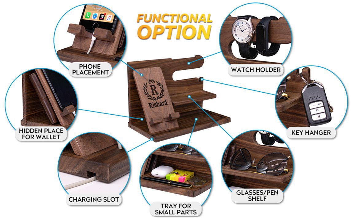 ออแกไนเซอร์โต๊ะข้างเตียงไม้ - ของขวัญวันเกิดที่ไม่ซ้ำสำหรับผู้ชาย