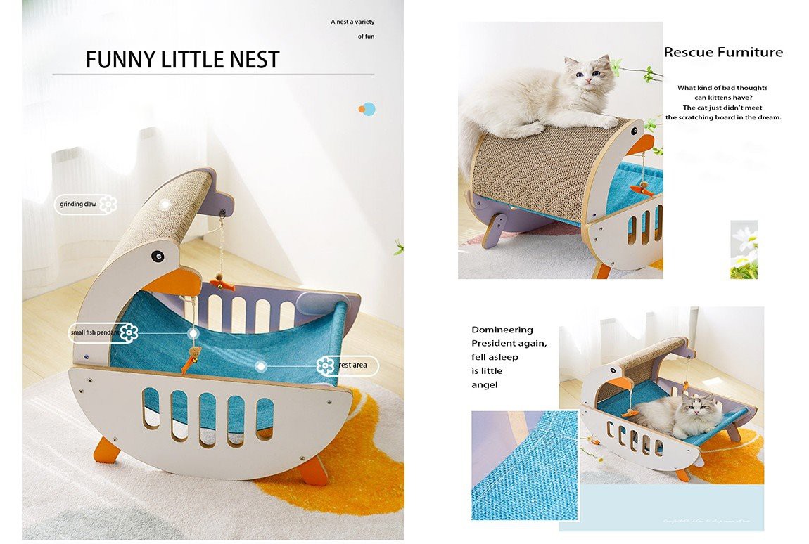 การใช้ไม้เนื้อแข็งทำให้เสียรูปและยุบได้ง่าย ผ้าที่ใส่สบายดูแลง่าย นั่งบนเส้นก๋วยเตี๋ยวที่กว้างและสะดวกสบายไม่ยุบง่ายและแมวอ้วนมีพื้นที่เพียงพอสำหรับนอน