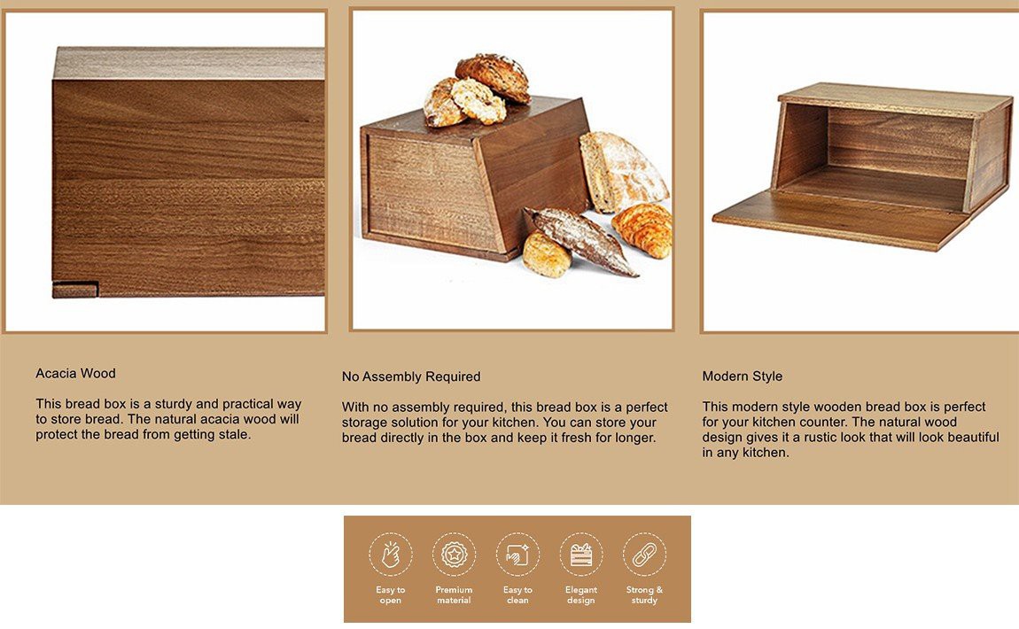 2. ใช้งานง่าย: ภาชนะใส่ขนมปังของเราทำจากไม้จริงและทนทาน การออกแบบสไตล์วินเทจที่ตกแต่งอย่างเป็นธรรมชาติช่วยให้ห้องครัวของคุณดูเป็นธรรมชาติ ไม่ต้องประกอบ กล่องขนมปังของเราพร้อมใช้งานทันทีที่คุณได้รับ