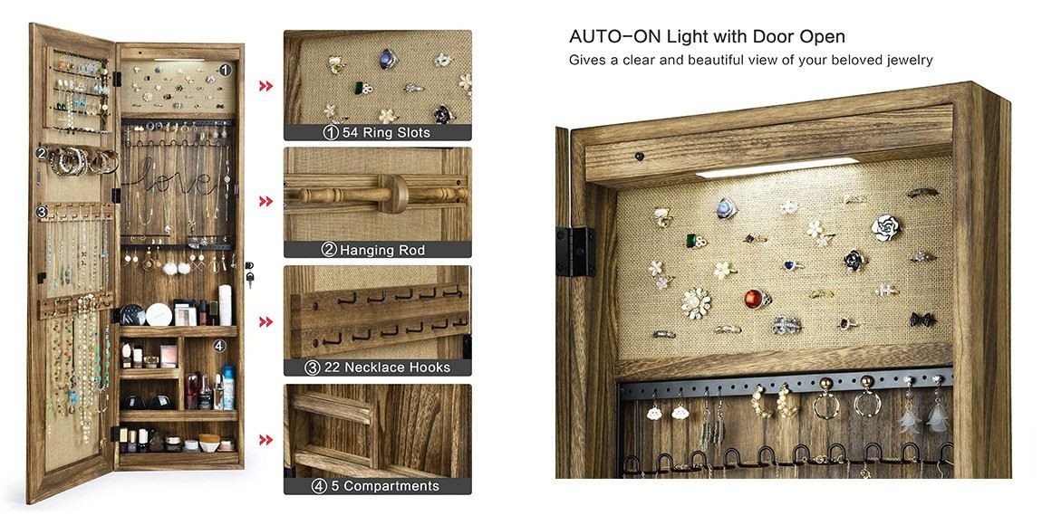 2. ตู้ที่มีกระจกและตัวล็อคประตู - กระจกเงาที่สะท้อนภาพจริงและให้มุมมองภายนอกตั้งแต่ศีรษะ-ถึง-นิ้วเท้า ประตูแม่เหล็กและล็อคได้พร้อมกุญแจช่วยให้เครื่องประดับของคุณปลอดภัย