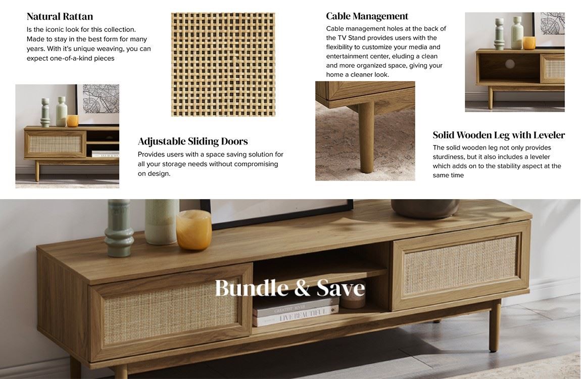 2) ชื่อเรื่อง:ขาตั้งทีวี 59" สำหรับทีวี 55/60 นิ้ว โบโฮบ้านไร่สไตล์โมเดิร์นพร้อมประตูบานเลื่อนหวาย ชั้นวางปรับได้สำหรับห้องนั่งเล่นที่สะอาดและเป็นธรรมชาติ
